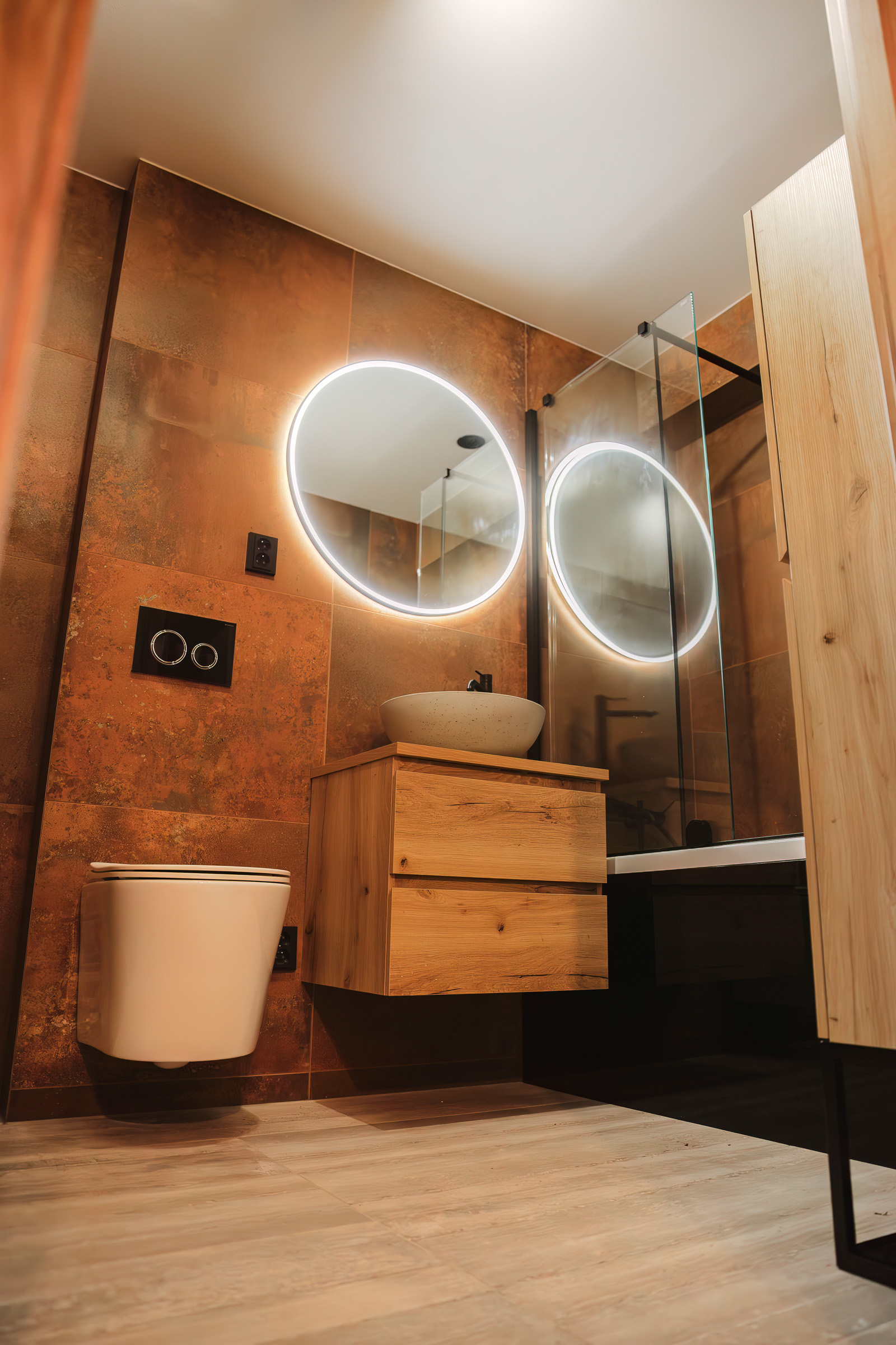 Nejvýraznější změnou byla úprava dispozice koupelny. Z původní malé koupelny o velikosti 3 m² jsme navrhli a vybudovali zcela novou koupelnu o 9 m², která poskytuje více prostoru, komfortu i úložných možností.